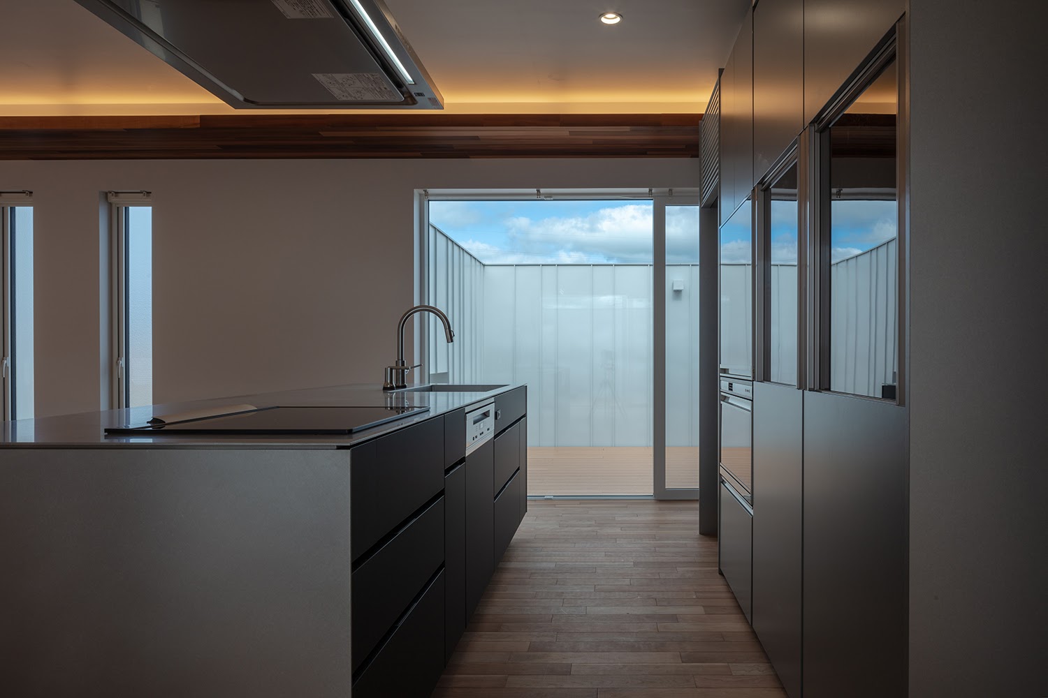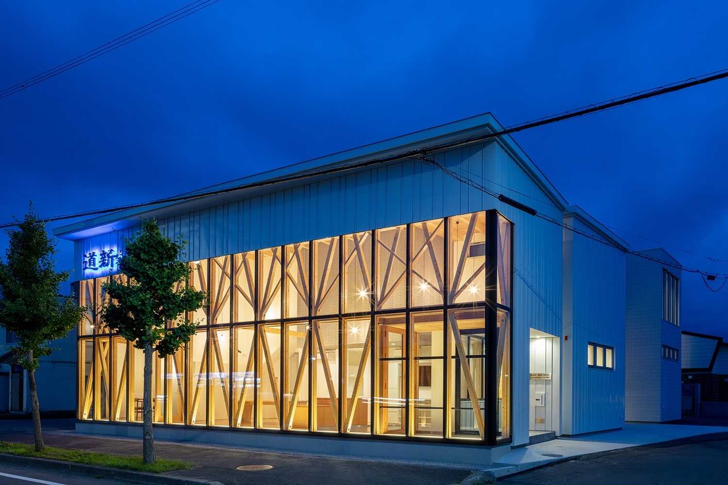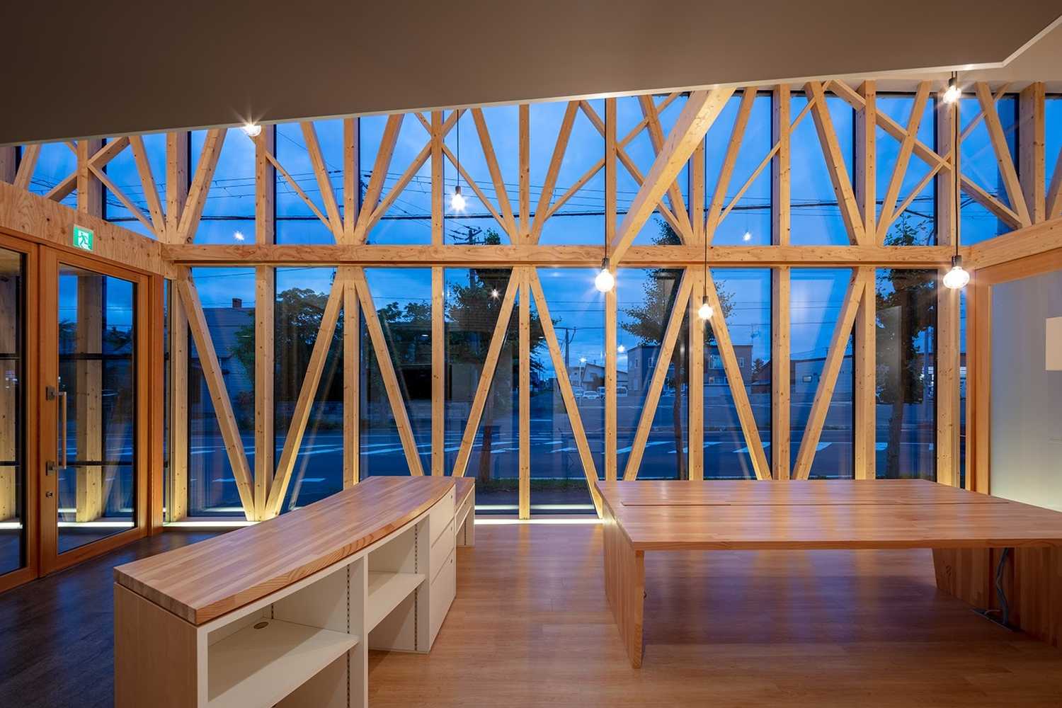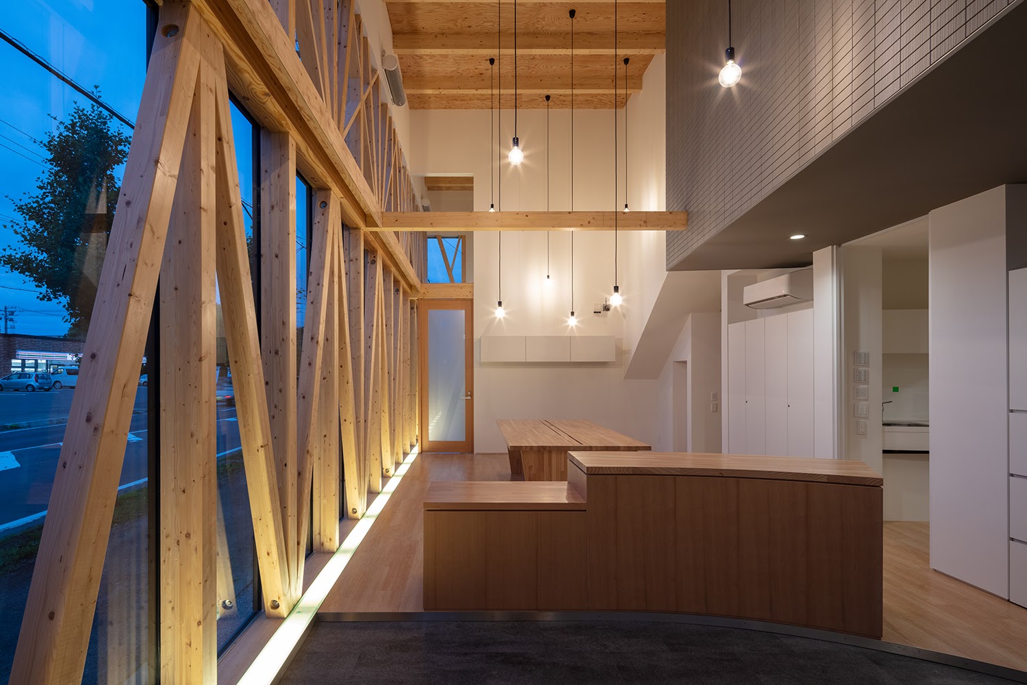 空間を要望されていたので、木軸を活かしたカーテンウォールを構成し